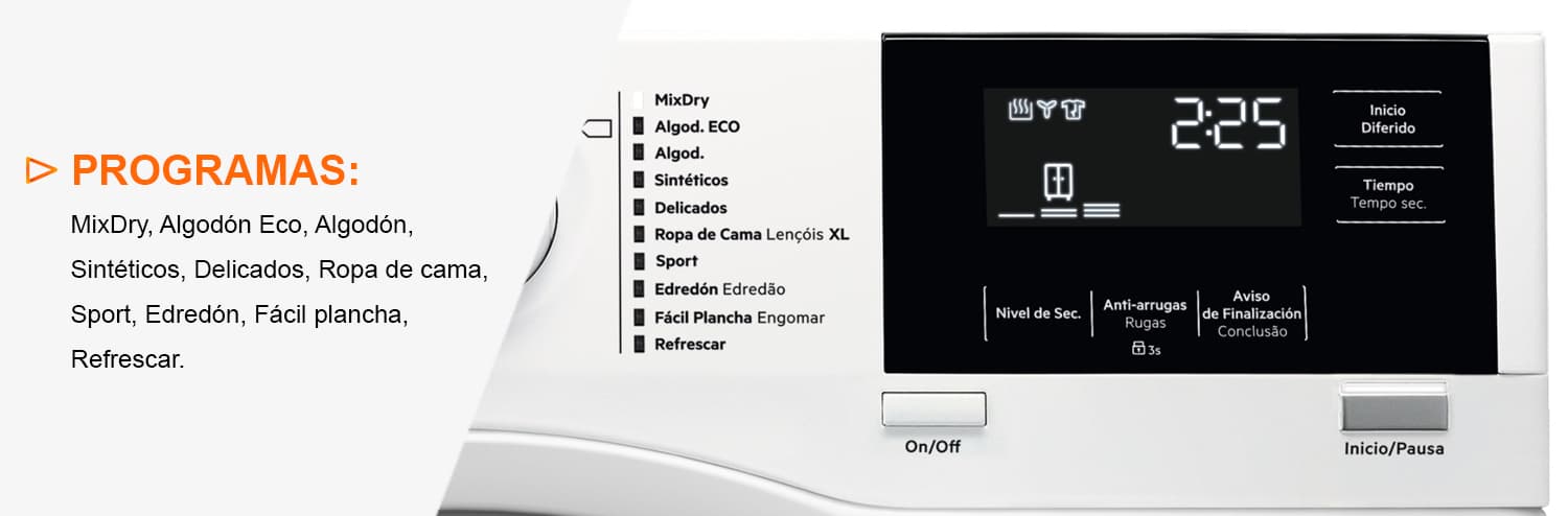 | Indicadores status secado | Secado, Enfriado, Fácil plancha, Seco armario, Secado extra, Anti-arrugas / fin |