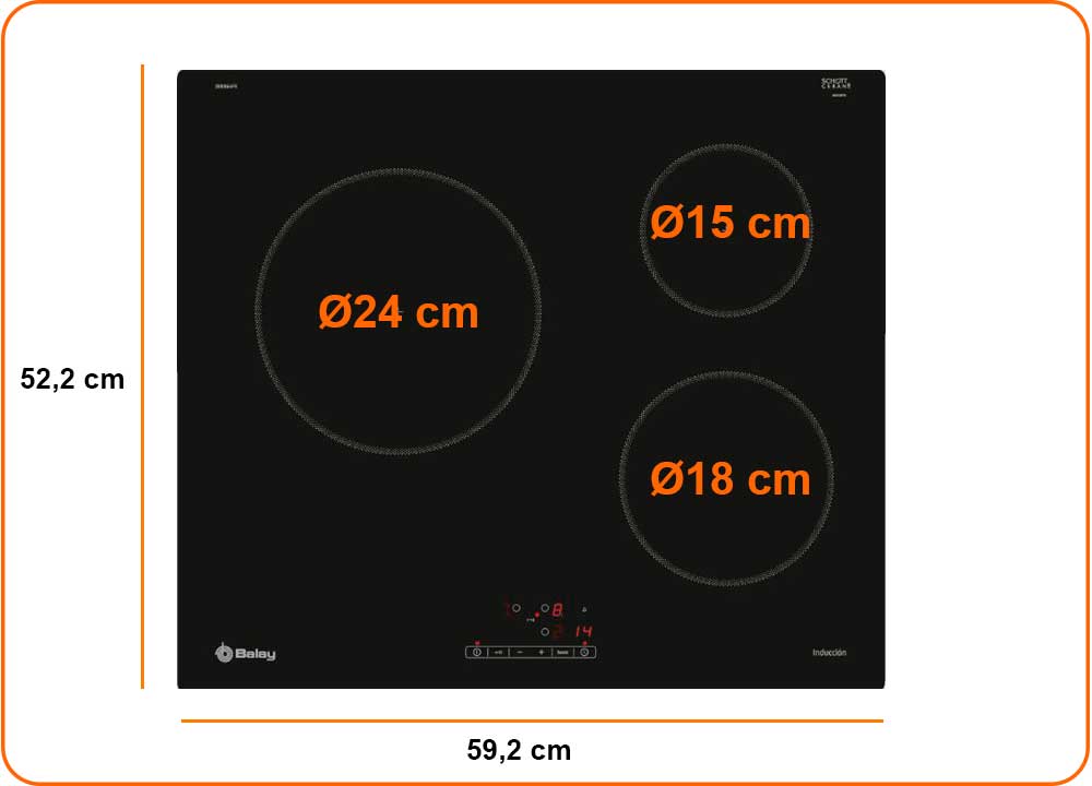 | Dimensiones de las zonas de cocción | 1 x 14,5 cm Ø, 1 x 18,0 cm Ø, 1 x 24,0 cm Ø |