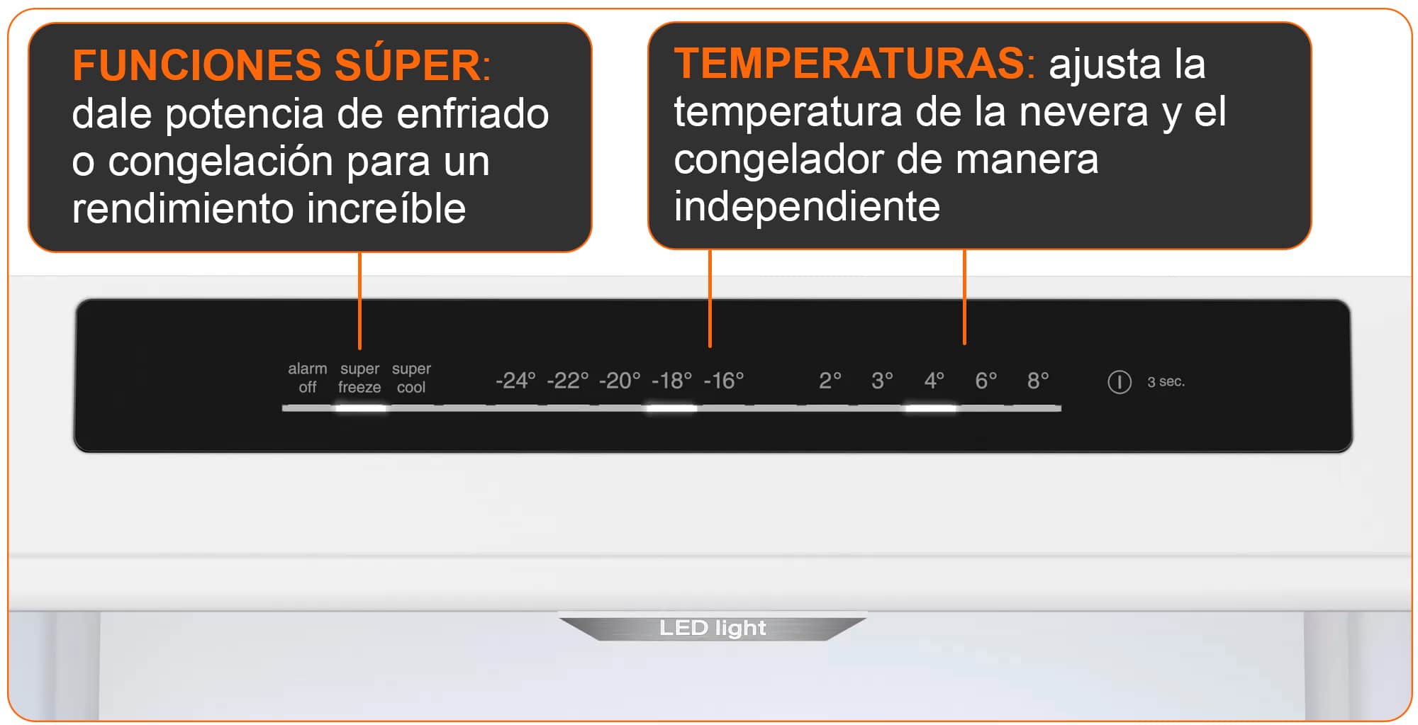 | Control e indicadores | Alarma de avería, Alarma de temperatura, Alarma puerta abierta, Indicador temperatura congelador, Indicador temperatura refrigerador, Interruptor supercongelación, Interruptor superrefrigeración |